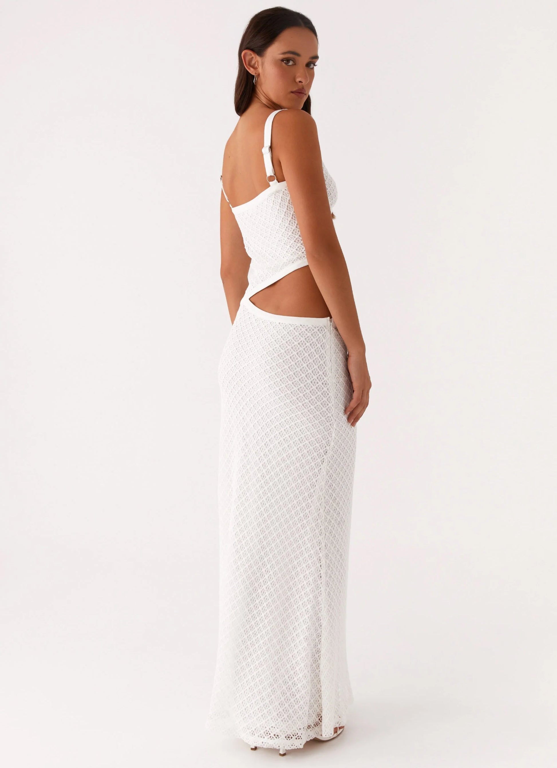 Sleeveless maxi dress with a flattering slim fit. Features a scoop neckline, adjustable spaghetti straps, and subtle cutout detailing. Crafted from a soft stretch blend for a sculpted silhouette and comfortable all-day wear.